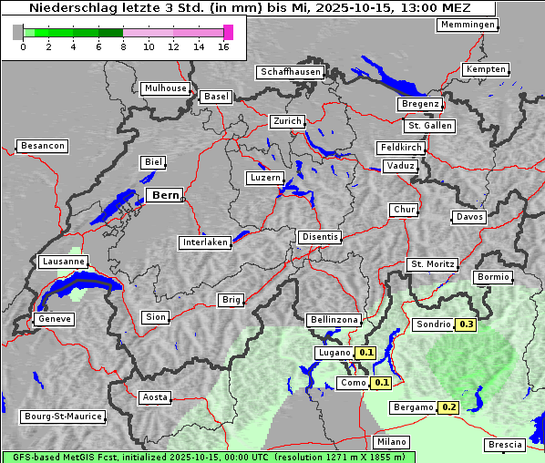 Dent de Cons (2062 m) befindet sich in der MetGIS-Vorhersageregion Schweiz. Dieses Produkt enthält Wetterprognosekarten für das Schweizer Staatsgebiet. Nördlich des Alpenhauptkamms ist das Land geprägt von mitteleuropäischem Übergangsklima, während südlich der Alpen mediterrane Einflüsse vorherrschen.