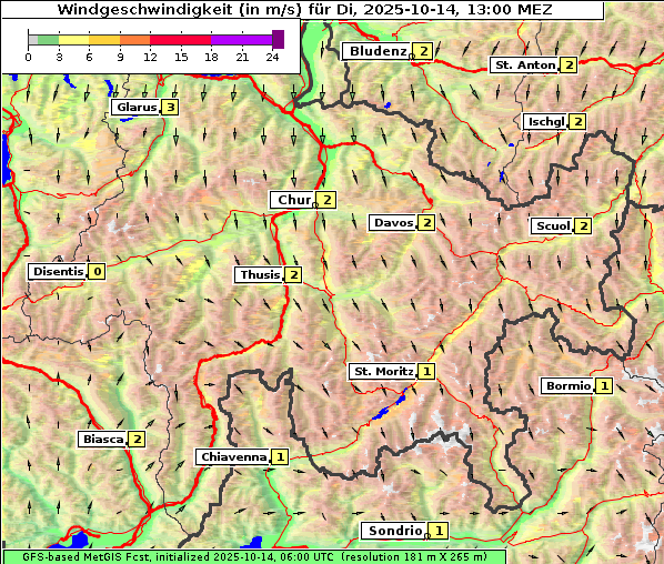 Heustock (2471 m) befindet sich in der MetGIS-Vorhersageregion Graubünden. Dieses Produkt zeigt die Wetterentwicklung für den Kanton Graubünden, welcher sich im Südwesten der Schweiz befindet. Hier entspringen südlich des Alpenhauptkammes der Po und nördlich davon die Quellflüsse des Rheins.