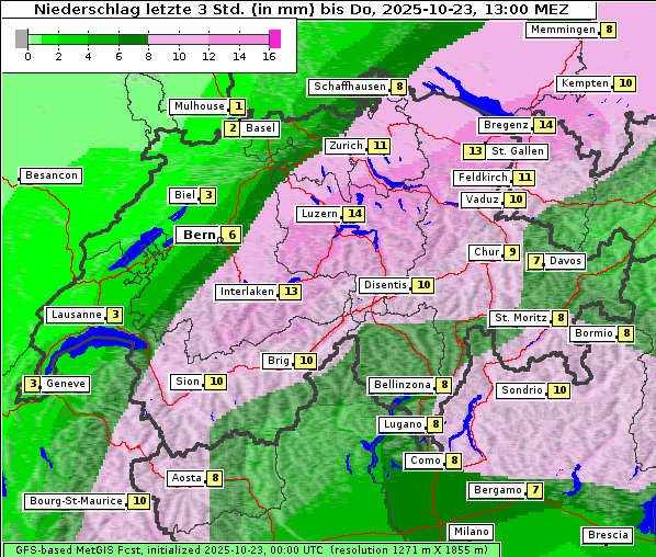 Monte Boggio (1470 m) befindet sich in der MetGIS-Vorhersageregion Schweiz. Dieses Produkt enthält Wetterprognosekarten für das Schweizer Staatsgebiet. Nördlich des Alpenhauptkamms ist das Land geprägt von mitteleuropäischem Übergangsklima, während südlich der Alpen mediterrane Einflüsse vorherrschen.