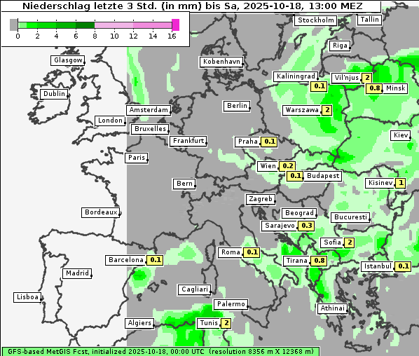 Monte Mannu (802 m) befindet sich in der MetGIS-Vorhersageregion Mitteleuropa. Die Mitteleuropakarten zeigen Vorhersagen für den Bereich der Britischen Inseln bis zur Ägäis und von der Iberischen Halbinsel bis zur Ostsee. Es kann ein Einblick in die Entwicklung der großräumigen Wetterlage über weiten Teilen Europas gewonnen werden.