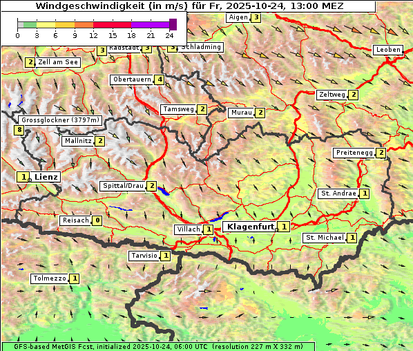 Watschig (597 m) befindet sich in der MetGIS-Vorhersageregion Kärnten. Die Vorhersagekarten für Kärnten, das südlichste Bundesland Österreichs, zeigen Wetterprognosen für das Gebiet zwischen dem Großglockner und der Packalpe. Abgesehen vom höchsten Berg Österreichs gibt es hier auch die meisten Sonnenstunden des Landes, obwohl Südwetterlagen mitunter extreme Niederschlagsmengen mit sich bringen können.